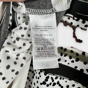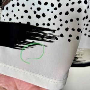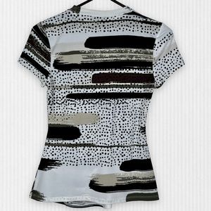 Easy to wear straight from the dryer - no need for an iron! Go-with-anything color palette of white background with spots and stripes pattern in shades of beige, black, brown, olive.
