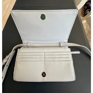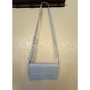 Brand new DKNY crossbody bag in a soft light blue color. Features the iconic DKNY logo on the front flap, adjustable strap, and wallet-style interior with card slots and zipper pocket.