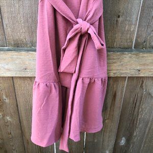 DKNY dress in dark rose lightweight polyester with ruffle sleeves, ruffle hem, and a tie waist. Can be worn on or off the shoulder.