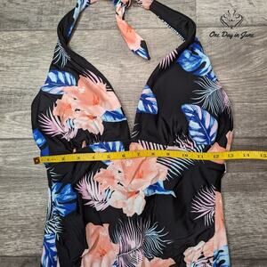 Presenting to you a charming offering from the renowned house of DKNY. This piece, crafted in a blend of nylon and spandex, boasts a fetching deep V halter design, awash in an elegant black and floral palette. It's a brand new piece, albeit without tags, poised to add a dash of sophistication to your aquatic endeavours.