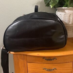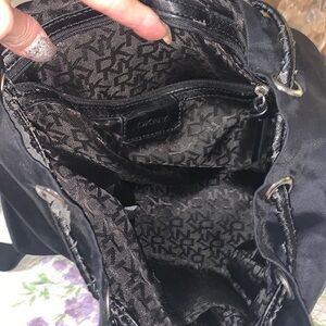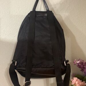 Very light weight nylon and leather long adjustable shoulder straps. Small handle on top inside has 1 zip pocket 2 slip pockets. Have some fraing on drawstring., does have some peeling around top , a backpack is certain to make your life easier when you need hands-free for traveling or carried books to school fall is perfect time for backpacks, and always in demand Approximate measurements are