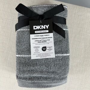 DKNY Eco-Melange 2 Pc Gray Hand Towels White Accent Super Soft Cotton NEW