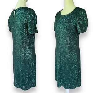 DKNY Emerald Green Stretch Sequin Stretch Crew Neck Short Ruched Puff Sleeve Keyhole Cutout Mini Cocktail Dress. Size Small.