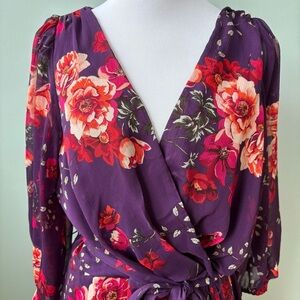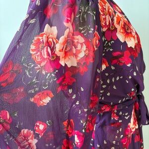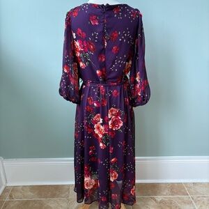 Chic DKNY dress with floral design. Rich purple hue. Ideal for stylish outings or formal occasions