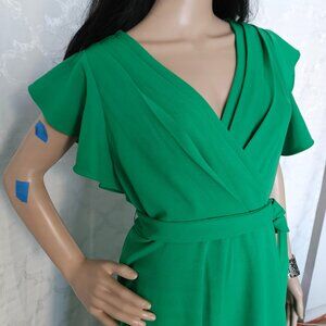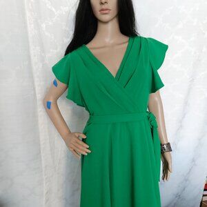 Elegant green flutter sleeve faux wrap midi dress, perfect for various occasions. This dress combines style and comfort with its flattering design.