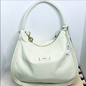 . Distinctive bag from Donna Karan featuring super soft genuine leather Features: Authentic DKNY Bag Color: cream Style name: Gansevoort W/ Mini Studs Material: 100% leather Gold hardware DKNY logo plaque in the front Detachable DKNY logo charm in pale gold-tone Top zip closure satin fabric interior One zip pocket and two slip pockets inside