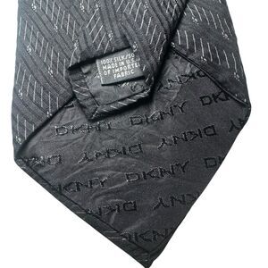 The DKNY Geometric 100% Silk Necktie is a high-quality designer accessory for men. Made in the USA, this black tie features a classic geometric pattern, crafted from luxurious silk fabric. The tie is adjustable and has a classic width and length, making it suitable for formal business attire. With its sleek design and high-end material, this DKNY necktie exudes sophistication and style, perfect for the modern man looking to elevate his business or formal look. 58" length, 4" width. Excellent condition. No rips/holes/tears/excessive stretching/stains/discoloration/snags. Kept in a smoke/pet free home.