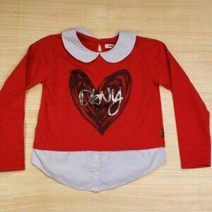 Girls DKNY layered long sleeve shirt. Has a faux button down look at hem an collar. Great condition other than the tiny hole at bottom Right corner Measurements are 13 1/2" from armpit to armpit, 17" from shoulder to hem, 6" from armpit to hem, and 17" sleeve.