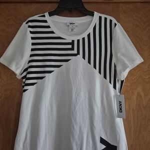 Chic DKNY dress with geometric black stripes on white. Bold DKNY logo accent.