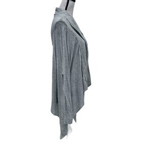 DKNY heather gray cotton open ruffle neck cardigan. There is an adjustable drawstring that goes from one front hem to the other around the neck and allow it to be worn with the front longer or shorter. You can control the amount of ruffle and length of sweater front. Creates a draped gathered front. Lightweight and super soft.