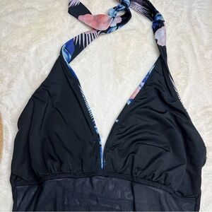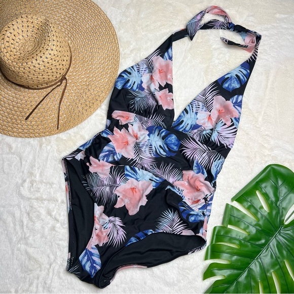 DKNY Halter Shirred One Piece Swimsuit With Tropical Floral Print