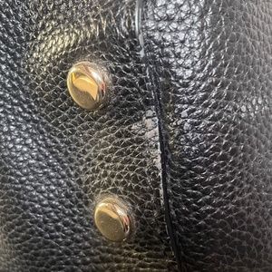 Cool black DKNY barrel purse with silver-colored studs. For some reason the DKNY logo and zipper are gold-colored but I like it that way. Selling because I have too many purses! This pebble leather handbag has a snap pocket on exterior front and a slip pocket on exterior back. Inside there is one slip pocket and one zippered pocket. There are two small spots with a bit of wear (see photos) on bag itself and a small area of wear on one of the handles. The bag does not come with a long strap because I do not have it.