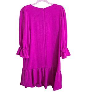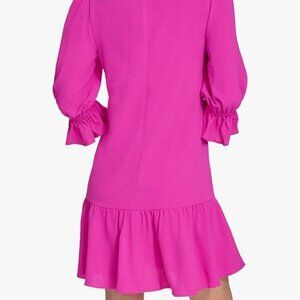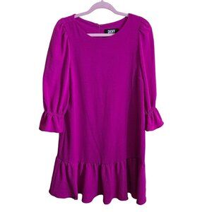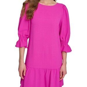 This DKNY dress features a stylish sheath silhouette with a peplum ruffle and 3/4 balloon sleeves. Its vibrant hot pink color makes it perfect for any occasion, offering both comfort and elegance.
