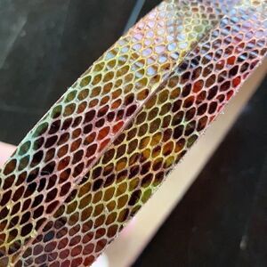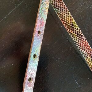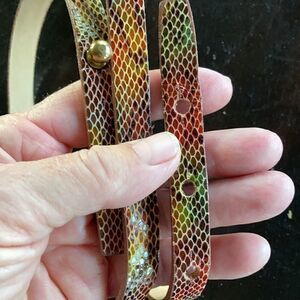 Supple DKNY Medium Italian skinny calfskin Reptile printed leather belt, multi rainbow colored with three holes and a brass closure. Extremely lightweight and supple.