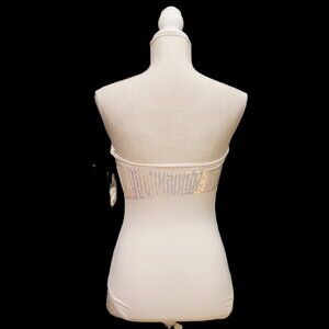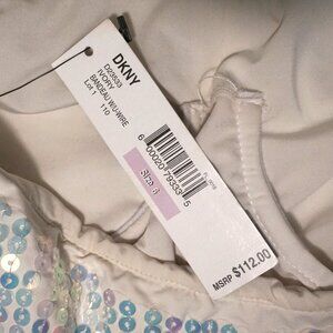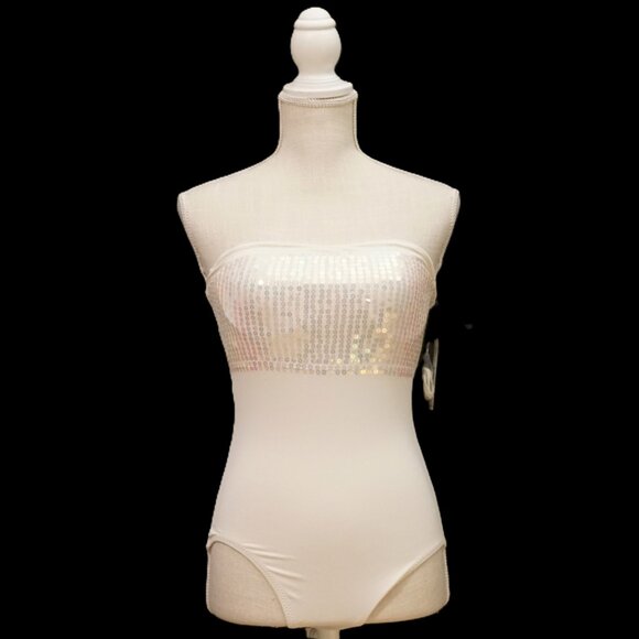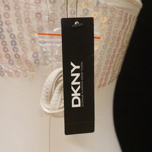 DKNY One Piece Swimsuit. Ivory. Bandeau. Built In Bra with Under Wire. Strapless. Strap Included. Sequin Band around Top. Nylon Blend. Women’s Size 6. New with Tags.