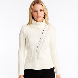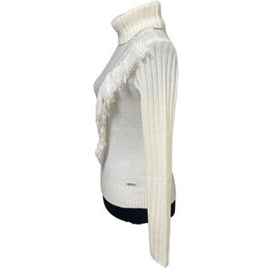 DKNY Ivory Fringe Ribbed Knit Turtleneck Sweater Boho Cozy Pullover Small