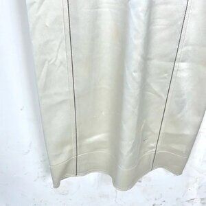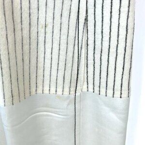Circa 2016, this dress from DKNY is made in a combination of ivory pinstripe wool on the top, and a thick tonal satin on the bottom. It features cap sleeves, a crew neck, topstitched satin finishings on the cuffs and neck, a straight-cut midi-length skirt with a back slit, and an invisible back zip closure.