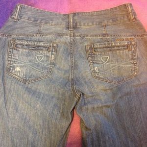 Straight legged denim jeans. Slit along inside seam of pant leg (about 1 inch) due to not fitting over boots. Worn 3 times.