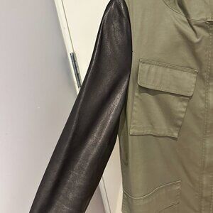 Fully lined, dark green canvas with leather sleeves.