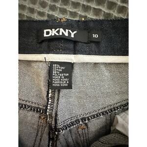Pinstripe DKNY vintage jeans. Really unique piece to add to your closet this fall. Dark wash denim with yellow gold stitching front and back.
