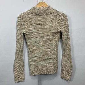 00s DKNY Jeans knit sweater in a beige/tan marled yarn with chunky cable knit details. Shawl-style foldover collar with a single button closure and ribbed trim. Features mixed knit textures through the sleeves and body with a flattering fitted cut. Small metal DKNY Jeans logo charm at the hem adds a cute touch.