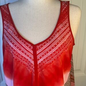 Stylish and vibrant, this red and pink patterned women's top is perfect for any occasion. Its unique design adds a touch of elegance to your wardrobe. Lightweight satin fabrication and a handkerchief hemline add modern styling to this tank top. It features a back slit keyhole and a fun V-shaped print with center front taping.Excellent Pre - Owned Condition.Armpit to Armpit 22” Length 26”
