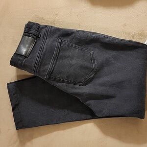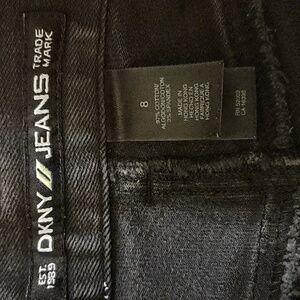 DKNY EST 1989 Trade Mark jeans. 5 pocket. Hand hemmed but appears to be easy to unsew to add another ~1" to inseam. Washed out black stretch cotton spandex. Waist measures 13.5" flat. 10" rise. 7" zipper rise. 25.5" inseam. 6" leg opening at hem. Size 8 EUC