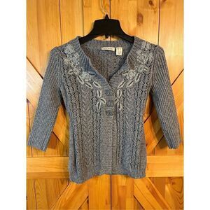DKNY Jeans Gray 3/4 Sleeve Cardigan Sweater with Floral Detail, Size Small pit to pit 17” length 21.5” (2552)