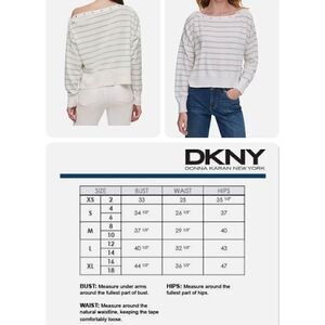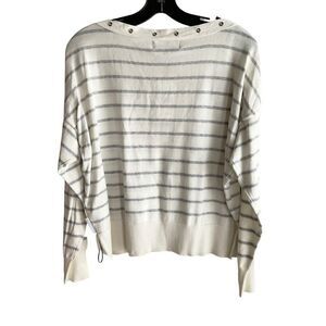 Sweater Snap Tape Trim Boat Neck by DKNY Jeans in Cream Grey Stripe Drop Shoulder Long Sleeves with Ribbed Cuffs Ribbed Hem with Side Slits Women Size Medium