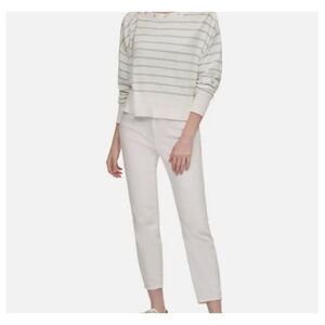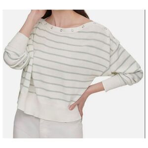 DKNY Jeans Sweater Snap Tape Trim Boat Neck Cream Grey Stripe Cotton Medium