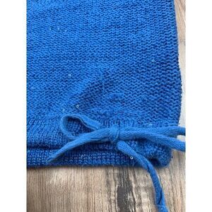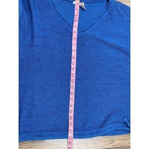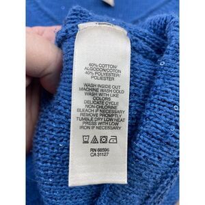 DKNY Jeans V-Neck sequin embellished sweater. XL 3/4 length roll up sleeves. Drawstring waist. Ties at the side. sequins randomly sewn throughout for a bit of sparkle. Gorgeous blue color. Some minor snags to mention. see pics for condition, details and measurements