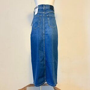 DKNY Jeans takes a classic denim five-pocket skirt in a new direction. This maxi version features a long slit at the front for movement and peek of leg.