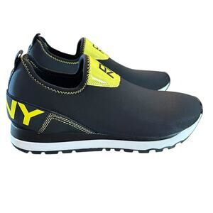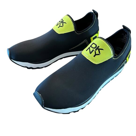 DKNY Jolie-Slip On Sneakers Neoprene Black Neon Yellow Logo NEW 7.5
