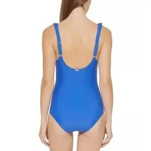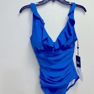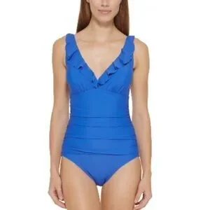 DKNY LAPIS Ruffle Plunge Underwire Tummy Control One-Piece Swimsuit Size 6 Blue
