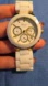 Elegant DKNY ceramic watch in white. Features a sleek design with gold accents.