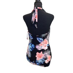 The DKNY Ladies Halter Shirred Swimsuit in size XLarge offers a stylish and flattering option for women looking for a one-piece swimwear. With a vibrant multicolor floral pattern, adjustable halter neckline, and tummy control features, this swim top is perfect for those seeking both fashion and function. Made from a blend of polyester, nylon, and spandex, it provides a slimming effect and is easy to care for with hand wash instructions.