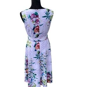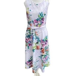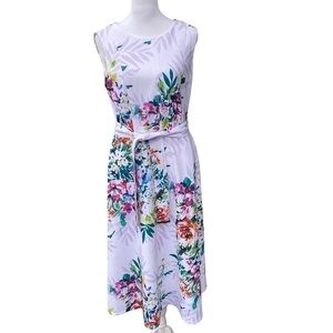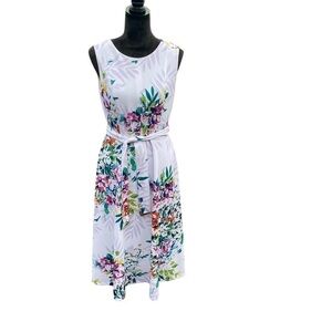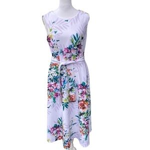 DKNY Ladies White Floral Sleeveless Midi A-line Round Neck Dress With Belt Sz 6
