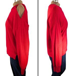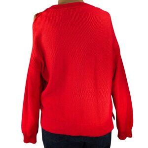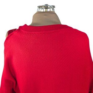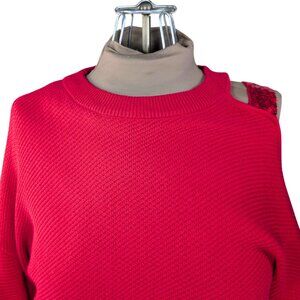 DKNY Large Red Chunky Waffle Knit Cotton Cold Shoulder Sequin Crewneck Sweater