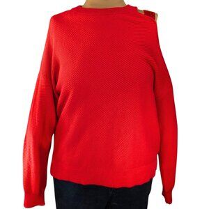 DKNY red knit crewneck sweater w/one cold shoulder & sequin detailing