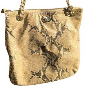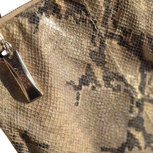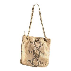 Gorgeous snake print leather shoulder bag by DKNY. Lining is completely intact with no holes, tears or stains. Two open slip pockets and 1 zippered pocket inside. Gold hardware. Leather laced chain shoulder straps. Excellent preowed condition.
