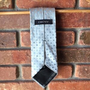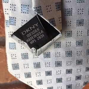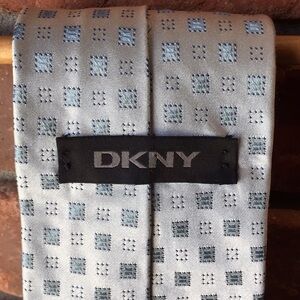 Here is a fun Men’s DKNY Light Blue Silk Tie. There are signs of wear like a light mark towards bottom as shown in close up picture. It measures approximately 59 inches.