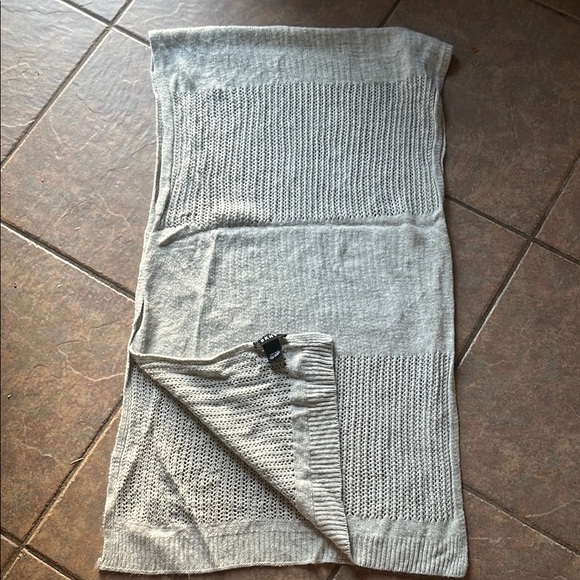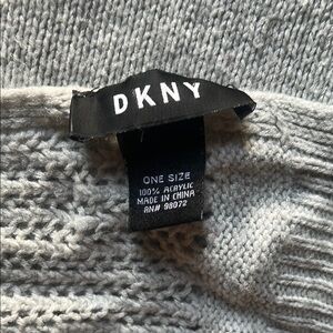 Soft DKNY knit scarf in light gray. Ideal for cozy layering.