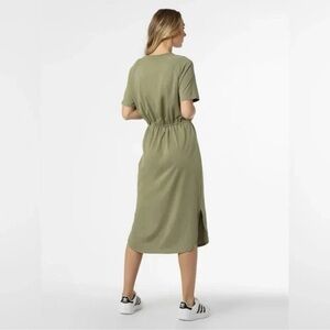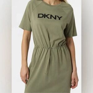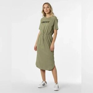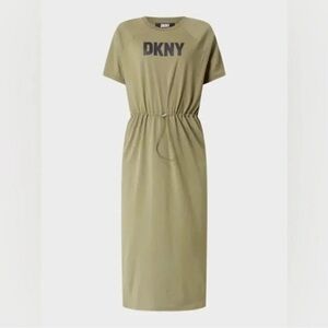 DKNY Logo Drawstring Waist Jewel Neck Short Sleeve Knit Midi Dress NWT
