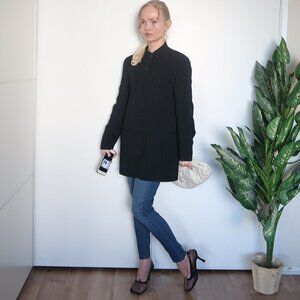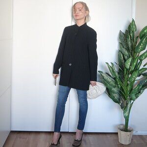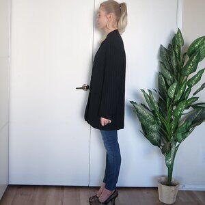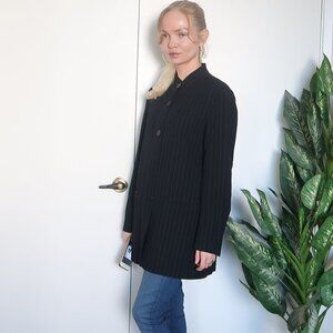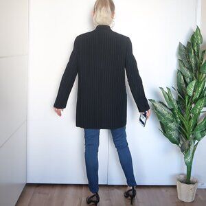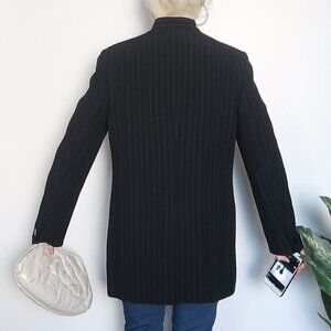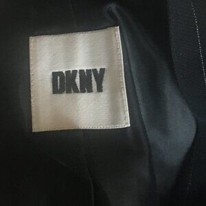 This DKNY long, single-breasted black pinstriped blazer is the quickest way to a pulled-together look. Stand collar. Has slit. 3 button closure. 2 functional pockets at the front. Classic, elegant suit / career / business blazer that's perfect for work, office, college, or business meetings. Run errands wearing with jeans and sneakers.