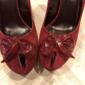 DKNY Maroon Laurel Flowered Suede Peep Toe Heels. DKNY maroon colored block heel. Suede and leather accent. Peep toe. 4” chunky heel 3/4” platform. Never worn. Size 10. Comes with original box.