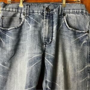 These DKNY Bleecker mens jeans are 68% cotton, 32% polyester. Machine wash and tumble dry. Relaxed, straight leg, back stitched pockets. Interesting whiskering effect. Hem has been taken up 2” but stitches could easily be removed, restoring the 32” length. Casual, comfortable, western, boho, relaxation, year round.