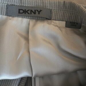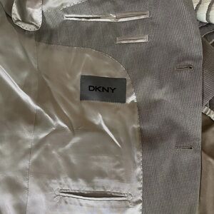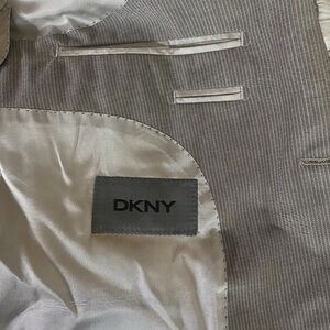 DKNY, Donna Karan, Suit Jacket, Blazer, Sport Coat, Grey, Pinstripe, 100% Wool, Business, Formal, Professional, Office, Wedding, Event, Classic, Slim Fit, Tailored, Modern, Pre-owned, Excellent Condition, Size 42R Workwear, Interview, Meeting, Special Occasion, Designer, Quality, Menswear