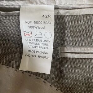 Elevate your professional wardrobe with this stylish DKNY men's suit jacket. This pre-owned jacket is in excellent condition, showing minimal signs of wear. Crafted from 100% wool, it features a classic grey pinstripe pattern, a two-button closure, and a fully lined interior with the DKNY brand tag. The jacket includes two front faux pockets, but has multiple functional inside pockets, including a jetted breast pocket and flap pockets at the waist, along with an interior buttoned pocket. The sleeves have four-button cuffs. This versatile piece is perfect for business, formal events, or smart casual attire.