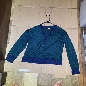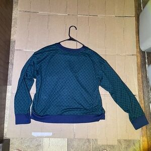 This handsome pullover features a subtle, all-over tonal DKNY monogram print in a deep teal-green, with contrasting navy blue trim on the V-neck placket, cuffs, and hem. The two-button henley-style neckline gives it a sophisticated yet relaxed feel. Crafted from a soft and comfortable fabric, it's a perfect layering piece for a smart, contemporary outfit.