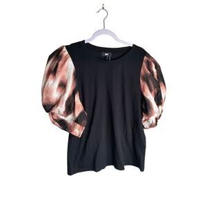 DKNY Mixed Media Puff Sleeve Blouse Crewneck Cotton Black/Abstract Dot Womens XL